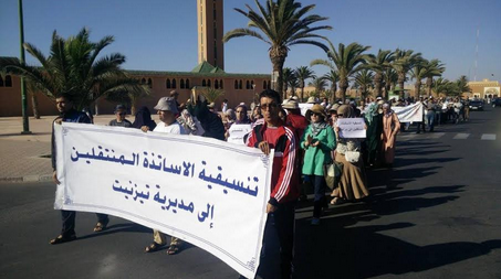 يشار إلى أن أساتذة “الحالات العالقة” من الحركة الانتقالية الوطنية والجهوية يخضوضن منذ أسبوعين وقفات احتجاجية واعتصامات مع مبيت ليلي أمام مديرية وزارة التربية الوطنية للاستجابة لملفهم المطلبي المتمثل في إسنادهم المناصب (المؤسسات التعليمية) التي عبروا عنها في طلبات المشاركة في الحركة الانتقالية الوطنية برسم سنة 2017.
