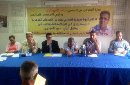 عبرت "هيئة التضامن مع حميد المهداوي وباقي الصحفيين المتابعين على خلفية حراك الريف " عن قلقها البالغ بسبب الوضعية الصحية الحرجة للمهداوي المضرب عن الطعام . و كشفت اللجنة خلال ندوة صحفية لتقديم تقرير عن "الخروقات الجوهرية الماسة بالحق في المحاكمة العادلة للصحفي حميد المهدوي" الاثنين بمقرالجمعية المغربية لحقوق الانسان، عددا من الخروقات التي شابت ملفه. موضحتا أن عددا من التجاوزات القانونية والقضائية حولت محاكمته إلى “مسرحية شكلية وهزلية”. ووصفت اللجنة القضاء بكونه اصبح آلية للانتقام والشطط في حق المدافعين عن حقوق الإنسان والحريات العامة، وفي مقدمتهم الصحفيون.
