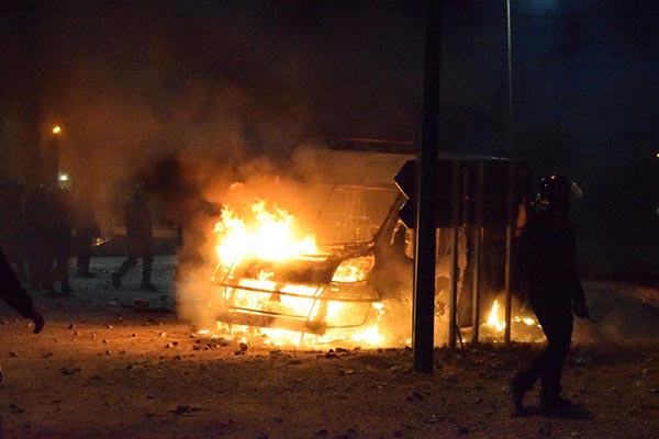 كما قام المتظاهرون بإحراق 5 سيارات تابعة للقوات العمومية وإلحاق أضرار مادية جسيمة بمجموعة من العربات والمعدات المستخدمة من قبل هذه القوات.