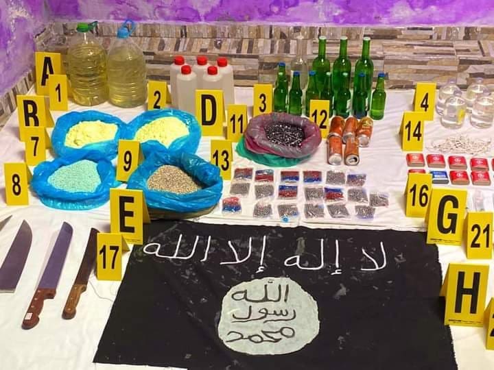 كما أسفرت عمليات التفتيش التي أجراها ضباط المكتب المركزي للأبحاث القضائية وخبراء مسرح الجريمة بمسكن بالمدينة القديمة وبمنازل المشتبه فيهم، عن حجز راية من الثوب تجسد شعار تنظيم "داعش"، ومخطوط ورقي يتضمن نص البيعة للخليفة المزعوم للتنظيم، وأسلحة بيضاء متعددة الأنواع والأحجام، ومعدات معلوماتية وأجهزة إلكترونية.