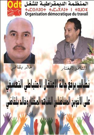 تتابع المنظمة الديمقراطية للشغل والمنظمة الديمقراطية للصحة بقلق بالغ واستياء كبير" القرار التحكمي القاضي باستمرار الاعتقال السياسي المغلف للنقابيين الشاهد المختار (المحال على التقاعد منذ 3 سنوات) وخالد بلقاضي (الممرض الممارس) وهما عضوان بالمكتب الوطني للمنظمة الديمقراطية للصحة وعضوا المجلس الوطني للمنظمة الديمقراطية للشغل، وذلك منذ ما يقارب 3 أشهر،في اطار مسلسل من التحقيقات البطيئة في اتهامات باطلة" .