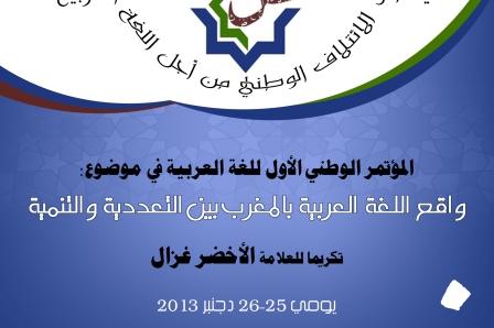 من المرتقب ان يصادق أكادميون و سياسيون و مثقون على على الميثاق الوطني للنهوض باللغة العربية خلال اختتام أشغال المؤتمر الوطني الأول للغة العربية في موضوع: "واقع اللغة العربية بالمغرب بين التعددية والتنمية" وتحت شعار: نحو استراتيجية وطنية للنهوض باللغة العربية تكريما للعلامة الأخضر غزال، يومي 20-21 دجنبر 2013 بالمركب الثقافي أكدال ابتداءا من الساعة التاسعة صباحا