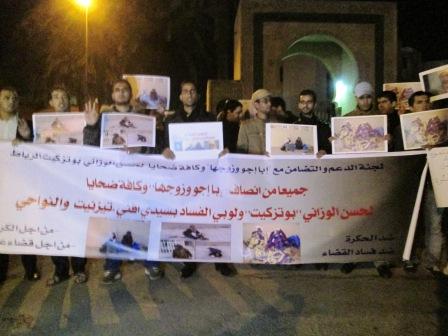 و رفع المحتجون لافتات تندد بتواطئ جهات قضائية مع لوبي الفساد العقاري بتزنيت و تطالب بمعاقبة الجناة. و اعتبر المحتجون ان القضاء لم يتحرك لكون ضحايا "مغرفة النار" من البسطاء و الفقراء.