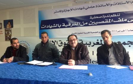 طالبت "الهيئة الوطنية لدعم الأستاذات والأساتذة حاملي شهادات الإجازة والماسترالمقصيين من الترقية «" خلال ندوة صحفية يوم الأربعاء 12 فبراير 2014 بمقر الجمعية المغربية لحقوق الانسان من الحكومة بإيجاد حل عاجل لهذا المشكل.