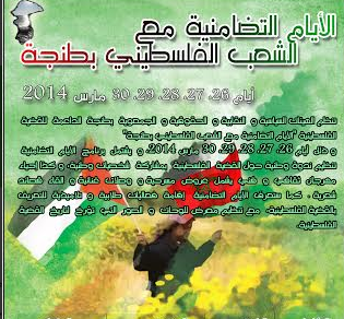 تنظم الهيئات السياسية و النقابية و الحقوقية و الجمعوية بطنجة الداعمة للقضية الفلسطينية "الأيام التضامنية مع الشعب الفلسطيني بطنجة" و ذلك أيام 26 ، 27 ، 28، 29، 30 مارس 2014.