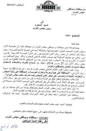 استنكر عدد من موظفي مجلس النواب في رسالة موجهة لمكتب المجلس ، التجاوزات التي يقوم بها رجال امن موضوعون رهن إشارة البرلمان، و مزاجية رئيس الأمن المحال على التقاعد و الذي مدد له لمرتين بتدخلات خارج إطار القانون.