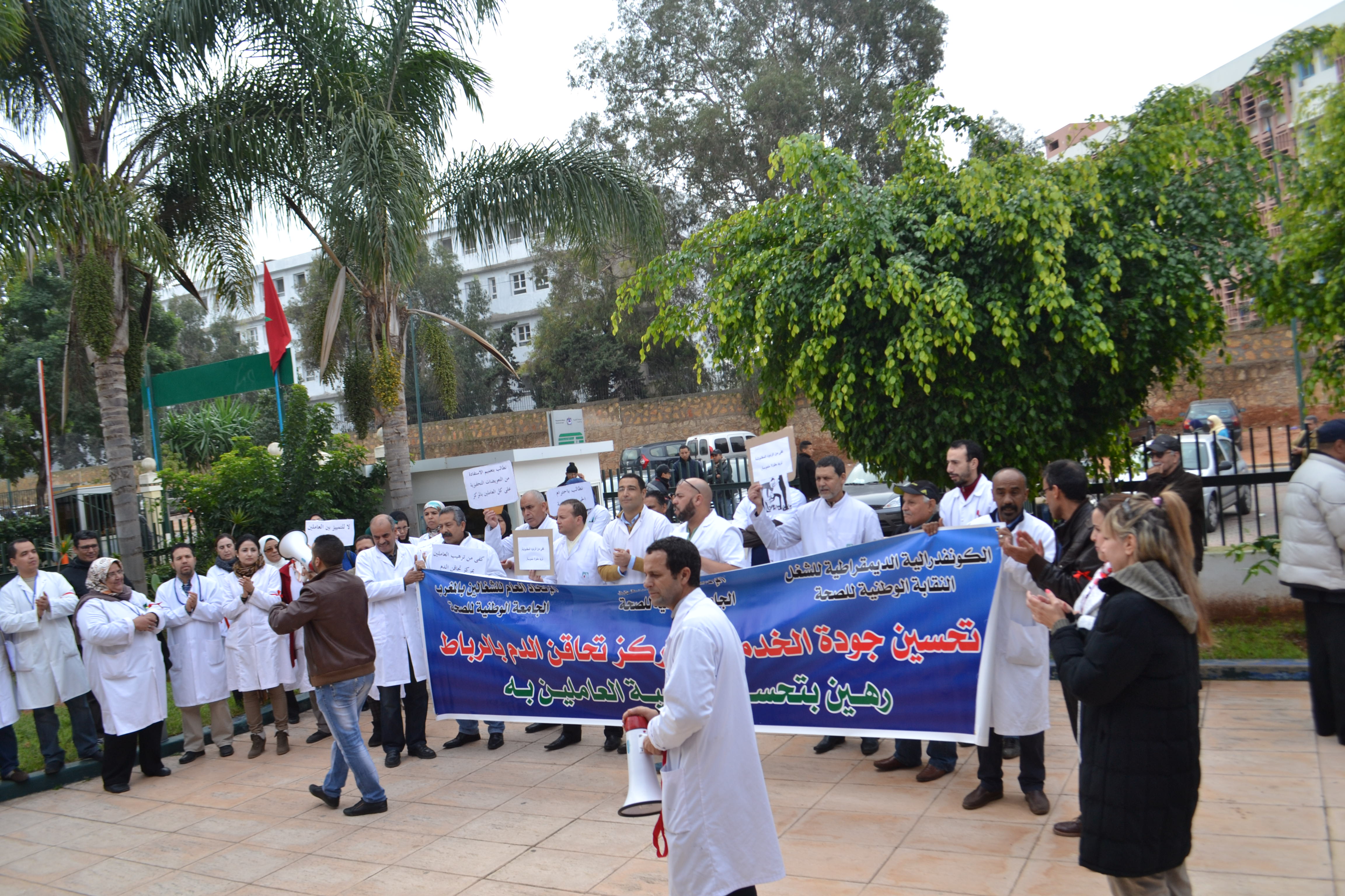 نظمت المكاتب المحلية بمركز تحاقن الدم بالرباط ،التابعة للنقابات الصحية المنضوية تحت لواء الاتحاد المغربي للشغل والكونفدرالية الديمقراطية للشغل والاتحاد العام للشغالين بالمغرب، وقفة احتجاجية ثانية يوم الخميس25دجنبر2014 بمركز تحاقن الدم بالرباط .
