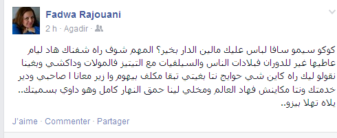 نشرت عضوة اللجنة الجهوية لحقوق الانسان باكادير و عضوة اللجنة الادراية لحزب لشكر، تدوينة على صفحتها بالفيسبوك اقل ما يقال عنها انها مخلة بالاحترام الواجب للملك. التدوينة الاضحوكة تبرز نوعية الاشخاص الذين لقطهم ادريس اليزمي من هنا و هناك على عجل و أتث بهم مجالسه الجهوية لحقوق الانسان.