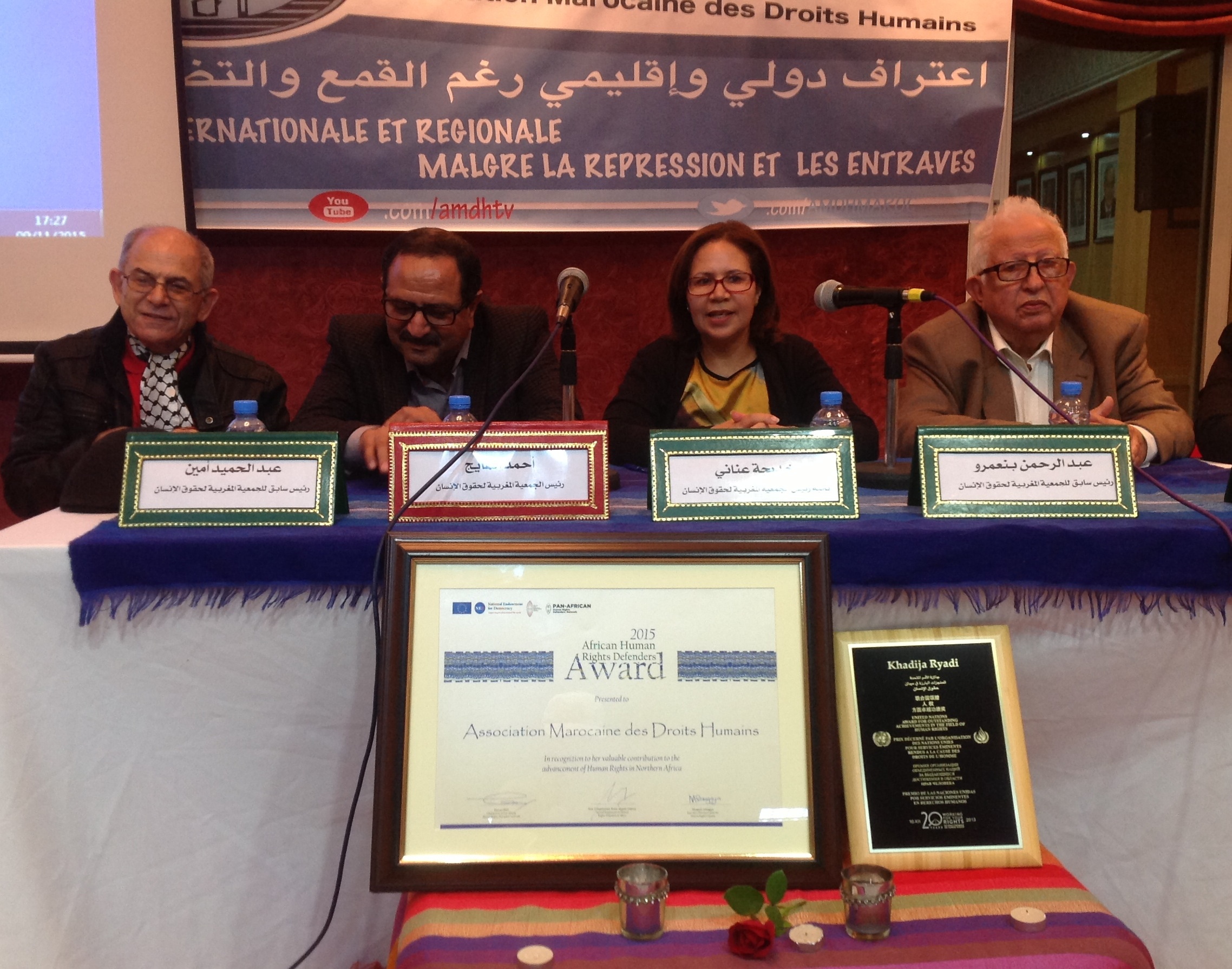 تحت شعار: "اعتراف دولي و إقليمي رغم القمع والتضييق" نظمت الجمعية المغربية لحقوق الإنسان، حفلا بمناسبة تسلمها الجائزة الإفريقية للمدافعين عن حقوق الإنسان، وذلك يوم الاثنين 9 نونبر 2015.