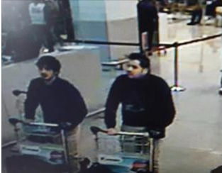 رصدت كاميرا المراقبة في مطار بروكسيل “زافنتم” شخصين بلحية وهما يهمان لتسجيل بضائعهم يعتقد أنهما منفذا الإعتداء الإرهابي في مطار بروكسيل.