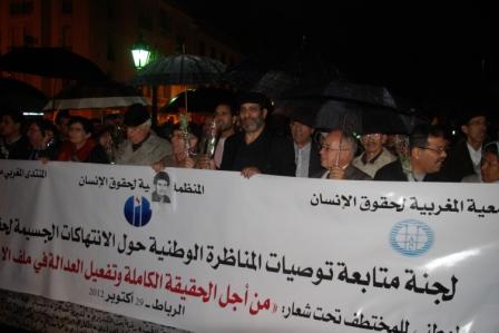 و طالبت من خلال كلمة المانوزي السلطات المغربية بتقديم كافة النتائج للرأي العام الوطني والدولي بخصوص الحقيقة الكاملة عن الحالات التي أبقت هيئة الإنصاف والمصالحة التحريات مفتوحة بشأنها، وضمنها ملفات المهدي بنبركة والحسين المانوزي ، والكولونيل الصقلي ،وعبد الحق الرويسي ووزان بلقاسم ،ومحمد عبابو ،والصالحي المدني ، وعمرالوسولي ، وسالم عبد اللطيف ،ومحمد بوفوس، ومحمد إسلامي، وعبد الحميد الإدريسي وكافة المختطفين مجهولي المصير
